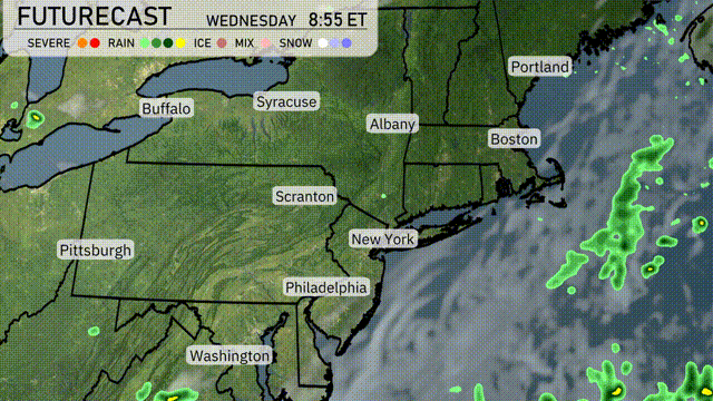 A cold front is set to move through the Northeast tomorrow, bringing scattered showers primarily in the morning hours. Syracuse may see some heavier downpours along with gusty winds, while New York City and Philadelphia could experience light rain. Temperatures will cool slightly, providing a brief respite from the summer heat. Expect improving conditions by the evening as the system clears out towards the Atlantic. Watch out for any localized flooding in areas with heavier rain, especially around hilly terrains.