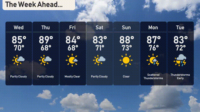 Wednesday: Partly cloudy with a warm high of 85 degrees and a low of 70 degrees.