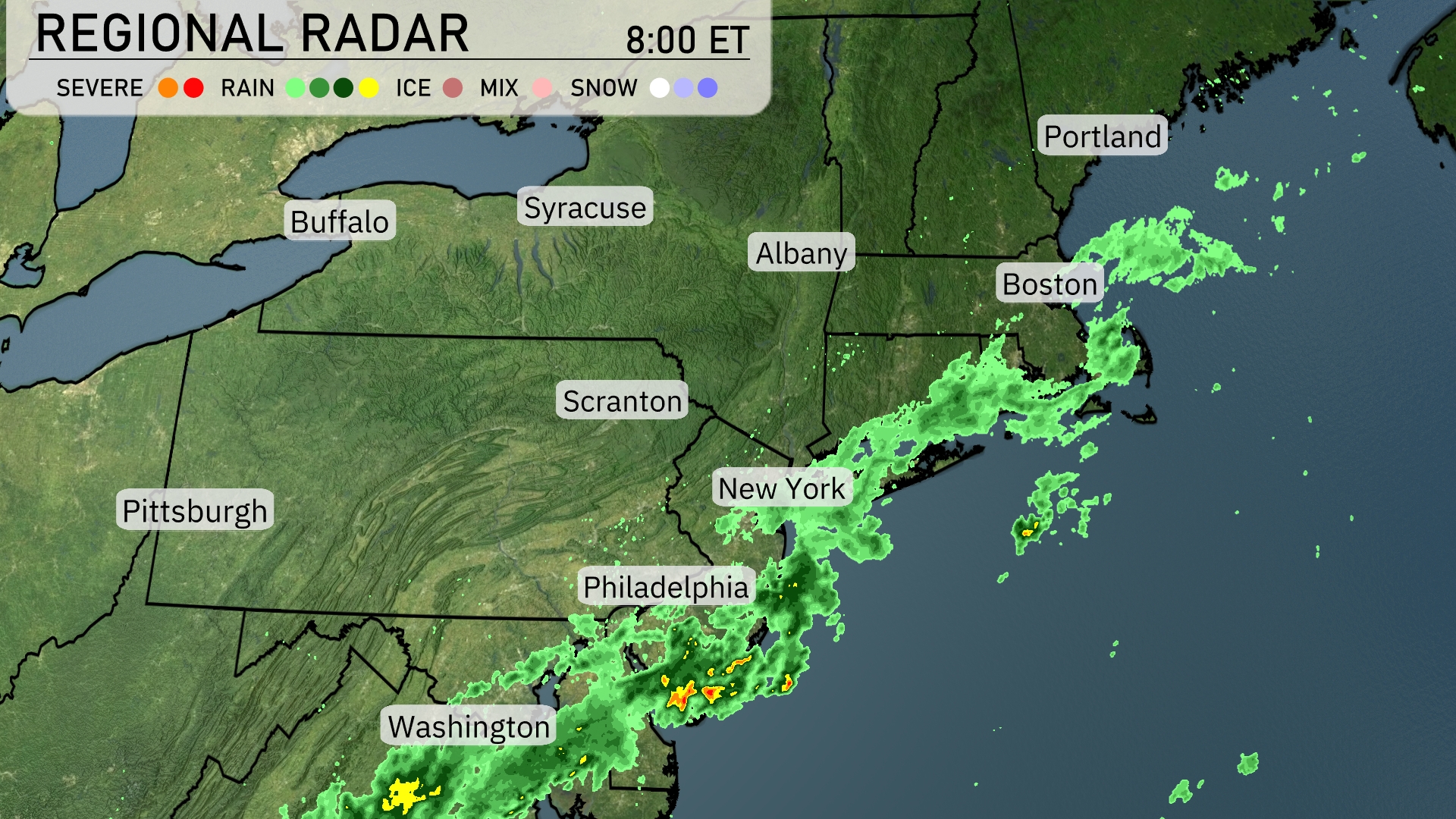 Morning showers stretch down from the northeast corner of the United States, with Boston and New York City under a blanket of light to moderate rain. Philadelphia and Washington, D.C. are experiencing showers with pockets of heavier rain as well. Cities like Scranton and Albany remain clear with a mix of clouds. Syracuse and Buffalo are still dry, with clear conditions prevailing across those areas.