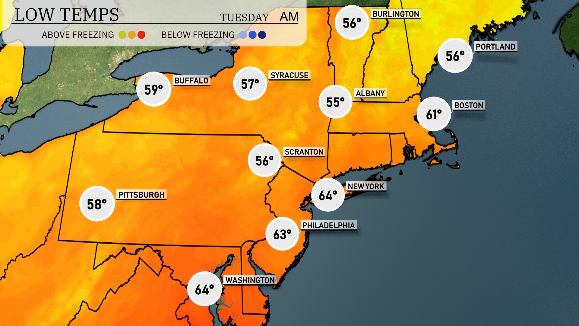 Tonight in the Northeast, expect lows to drop to 55 degrees in Albany and 56 in Scranton. New York City will cool off to 64 degrees, while Philadelphia hovers at 63. Boston and Portland will see similar temperatures, both settling at 56 degrees. Buffalo is relatively mild at 59 degrees, with Pittsburgh close behind at 58.