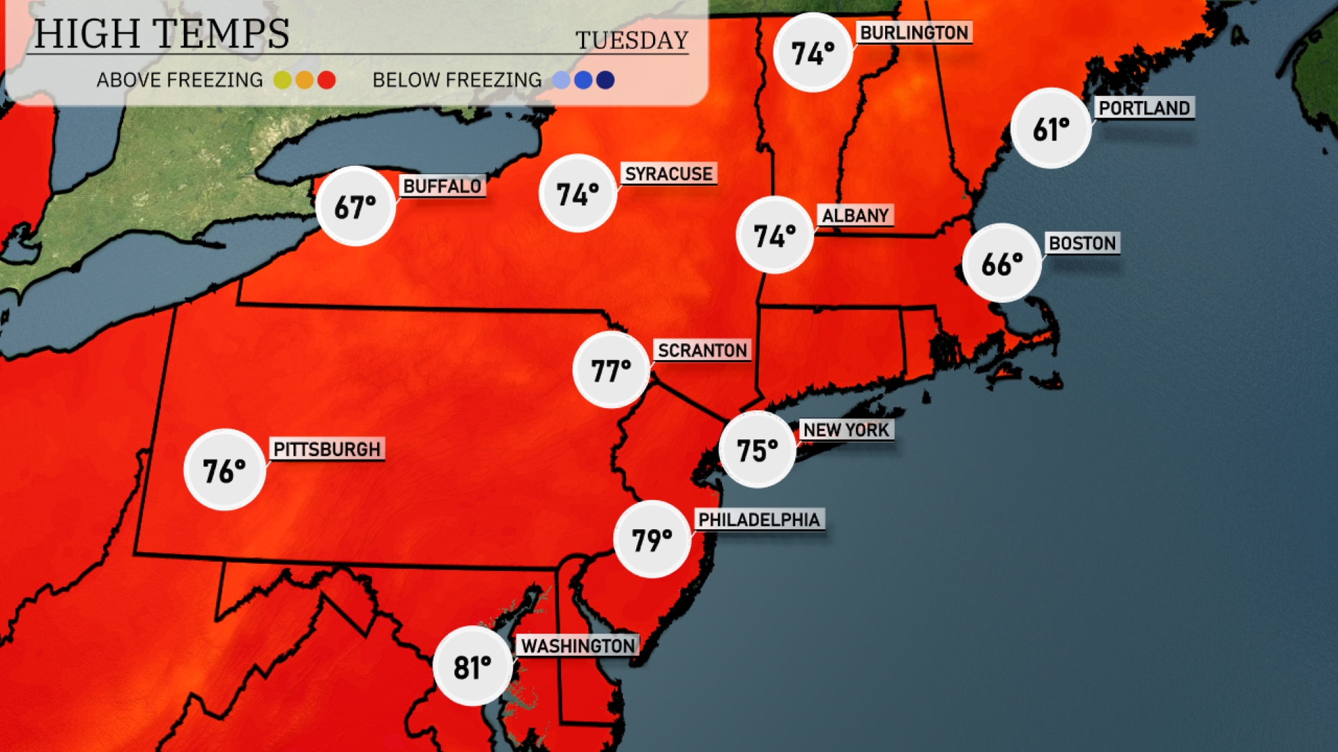 Tomorrow Philadelphia is expected to be warmer at 79 degrees. Scranton will see a high of 77, closely followed by Pittsburgh at 76 degrees. Further north, Albany and Syracuse will hit 74 degrees, with Buffalo slightly cooler at 67 degrees. Boston will experience a high of 66, continuing a trend of below-average temperatures compared to the rest of the region.
