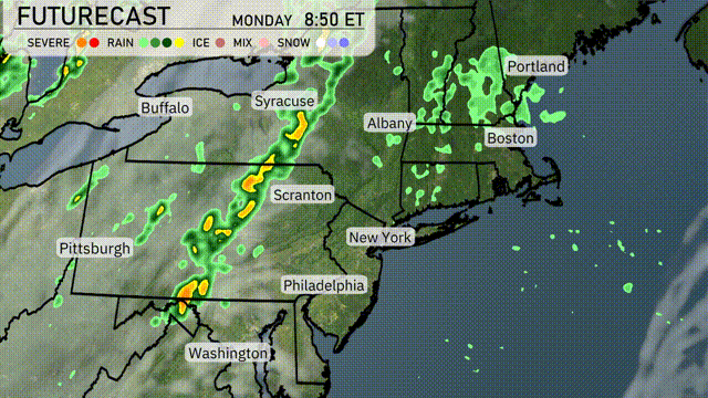 A cold front moves into the Northeast overnight, bringing a line of potentially strong storms from Buffalo to Philadelphia. Expect gusty winds and heavy downpours that could lead to localized flooding, especially in low-lying areas. By tomorrow afternoon, the front pushes through Albany and Boston, with rain showers tapering off by evening. Temperatures will drop behind the front, leading to cooler and drier conditions for Wednesday. Be prepared for possible travel delays due to wet and slick conditions during the morning commute.