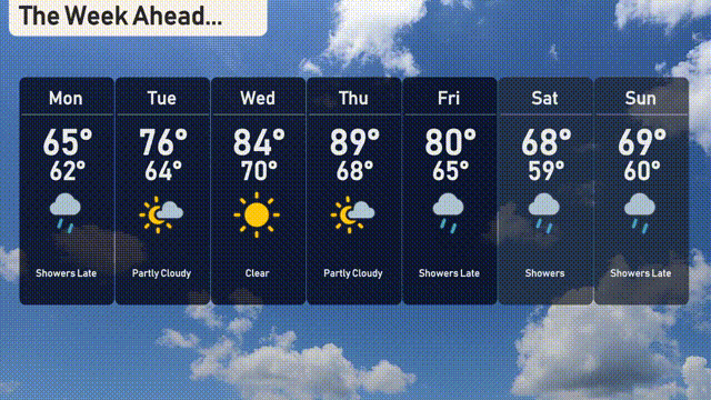Sunday: More late showers as temperatures reach a high of 69 degrees and a low of 60 degrees.