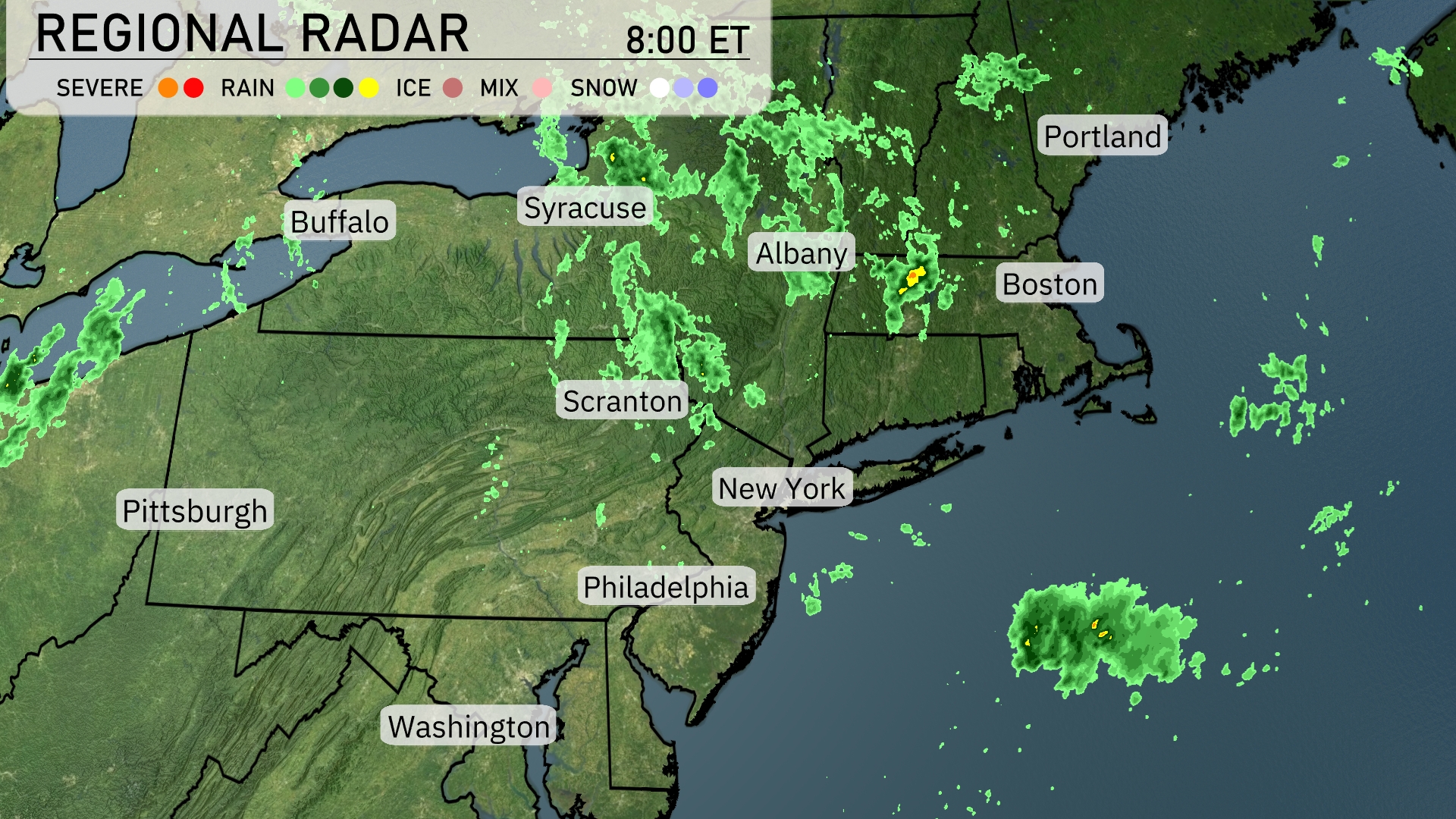 On the regional radar, we see showers extending from Pittsburgh all the way to Boston, with light to moderate rain occurring over Syracuse and Albany. New York City and Philadelphia are experiencing cloud cover, though dry conditions currently prevail. Scattered rain is detected near Scranton, moving northeast. An isolated thunderstorm is visible off the coast southeast of Cape Cod.