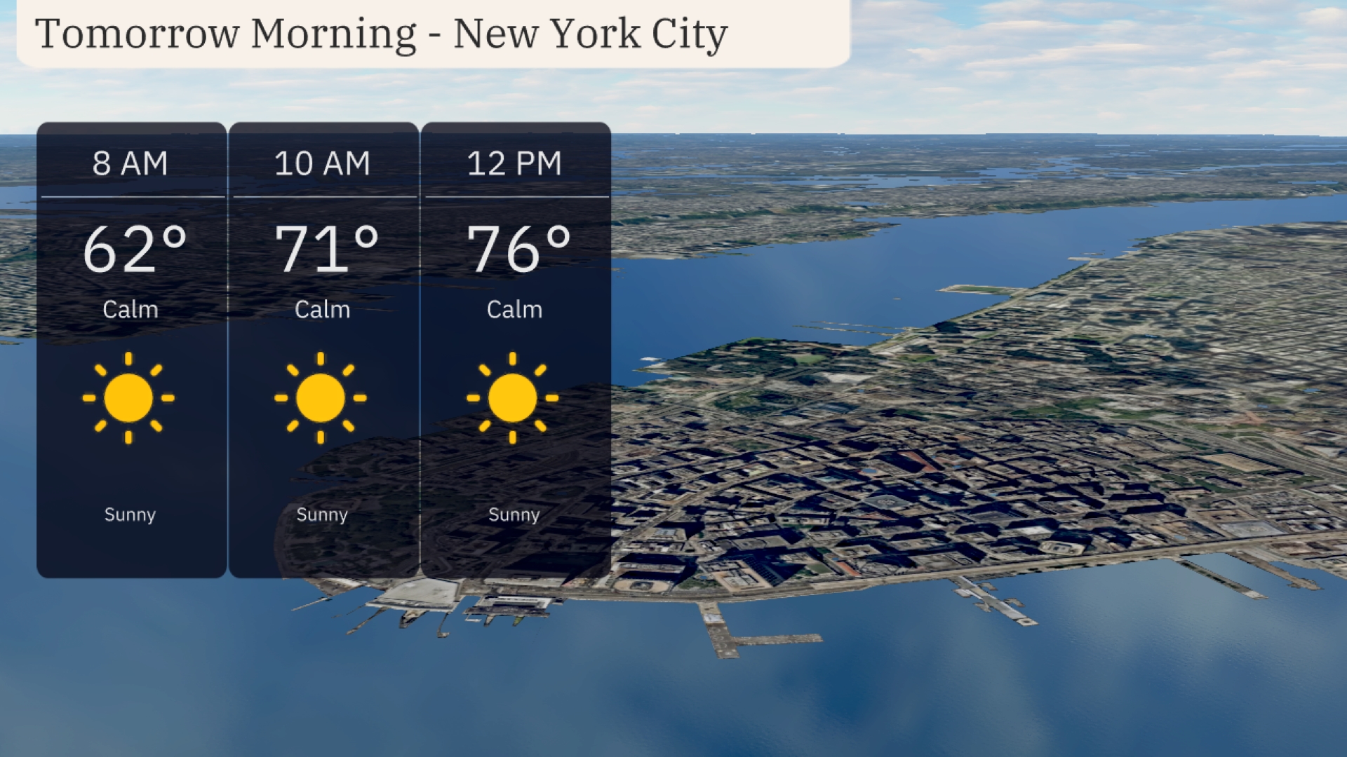 For tomorrow morning in New York City, expect a sunny and calm start to the day. Temperatures begin at 62 degrees at 8 AM, warming to 71 degrees by 10 AM. By noon, temperatures will reach 76 degrees.