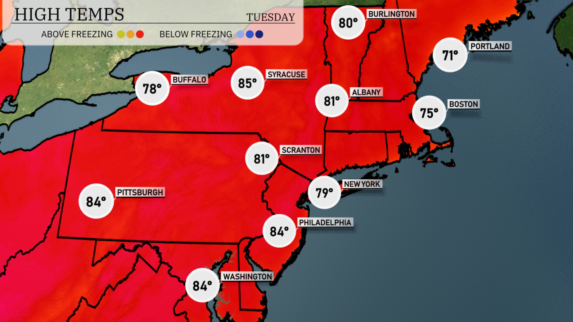 Tomorrow Buffalo will see a high of 78 degrees, while Syracuse is set to reach a warm 85 degrees. Philadelphia and Pittsburgh are both forecasted to hit 84 degrees, contributing to a trend of elevated temperatures throughout the region. New York City is looking at a pleasant 79 degrees, and Boston will warm up to 75 degrees.