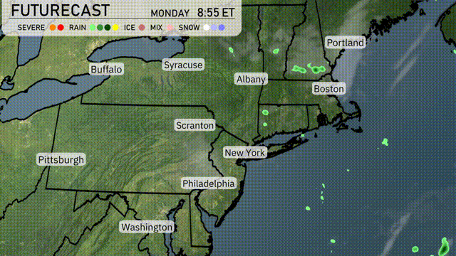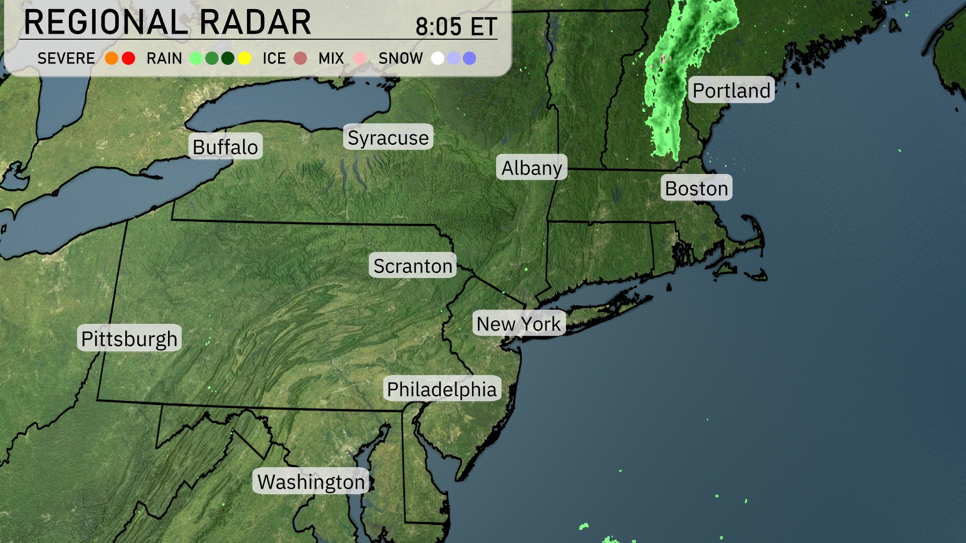 Rain is advancing through New Hampshire and Vermont and moving into Maine, where Portland is experiencing a steady downpour. Boston and Albany remain dry for now, but clouds are on the increase ahead of the showers. Scranton, Syracuse, and Buffalo are enjoying clear conditions under mostly sunny skies. Philadelphia and New York City are currently dry with no imminent precipitation. Washington D.C. stays clear as the system is primarily affecting northern New England.