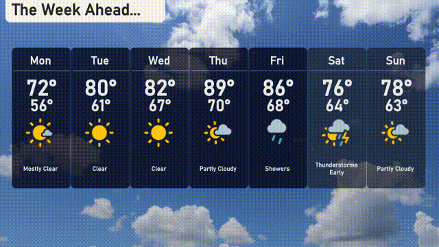 Thursday: Mostly sunny, warming up further with a high of 89 degrees and a low of 70 degrees.