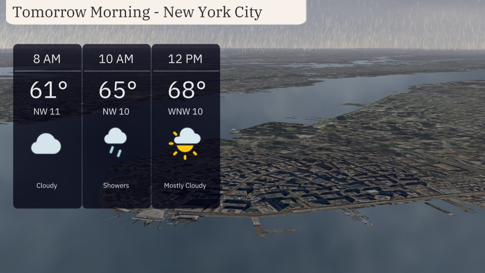 Tomorrow morning in New York City starts with a cloudy sky and a temperature of 61 degrees at 8 AM with northwest winds at 11 miles per hour. Expect a brief shower around 10 AM as temperatures rise to 65 degrees, with northwest winds continuing at 10 miles per hour. By noon, the sky becomes mostly cloudy with a temperature of 68 degrees and winds shifting slightly to west-northwest at 10 miles per hour.