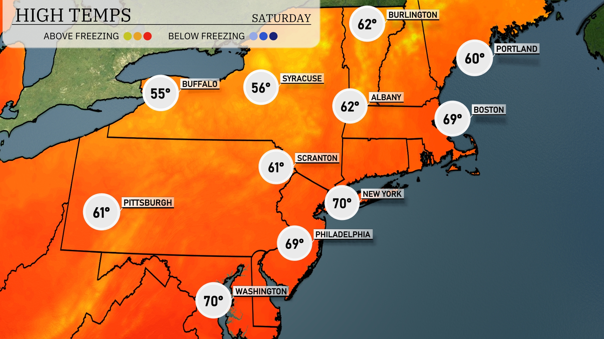 Tomorro New York City and Washington, D.C. both reach highs of 70 degrees. Philadelphia is set for a high of 69, while Boston will see a comfortable 69 degrees as well. Pittsburgh and Scranton will experience cooler conditions at 61 degrees. Buffalo and Syracuse lag behind, with highs of 55 and 56 degrees, respectively, due to lingering cloud cover.