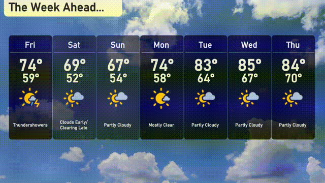 For the 7-Day Forecast in New York City: Friday: Keep an umbrella nearby with thunderstorms throughout the day. Expect a high of 74 degrees and a low of 59. Saturday: Morning clouds will give way to clearer skies by evening. Highs will reach 69 degrees with a low at 52. Sunday: Mostly sunny skies with a slight breeze. The high temperature climbs to 67 degrees, and the low will settle around 54. Monday: A mostly clear day on tap, warming up nicely to 74 degrees with a low of 58. Tuesday: Partly cloudy conditions bring a slight increase in temperature, peaking at a warm 83 degrees and cooling down to 64 at night. Wednesday: Enjoy another day with partly cloudy skies, temperatures rising to 85 degrees, and dipping to 67 in the evening. Thursday: Rounding out the week with pleasant partly cloudy skies, expect a high of 84 degrees and a nighttime low of 70.