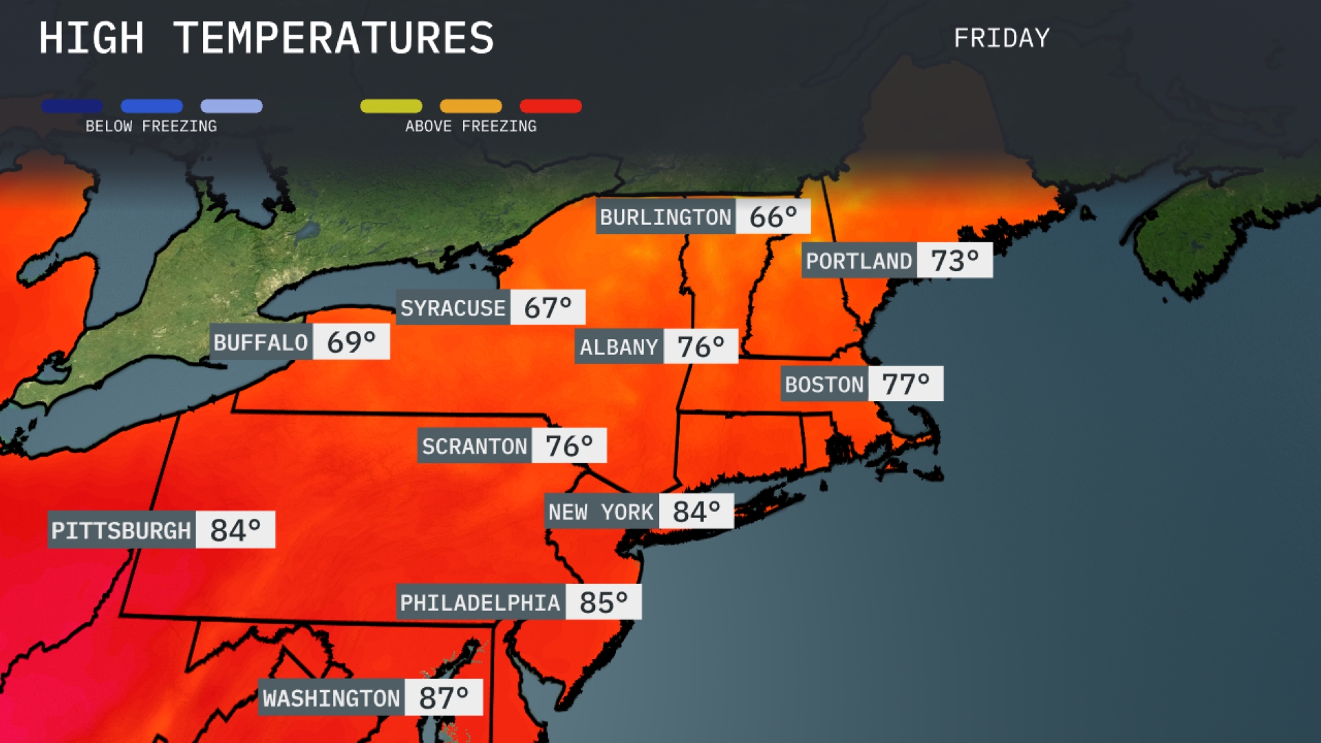 Tomorrow in the Northeast, temperatures will be unseasonably warm for mid-September. New York City is expected to reach a high of 84 degrees, while Philadelphia will top out at 85 degrees. Boston is forecasted to hit 77 degrees, alongside Albany at 76 degrees, both well above average for this time of year. Pittsburgh will also see warm conditions with a high of 84 degrees. This warmth is influenced by a dominant high-pressure system bringing steady, clear skies across the region.
