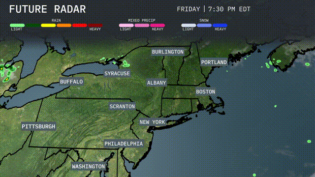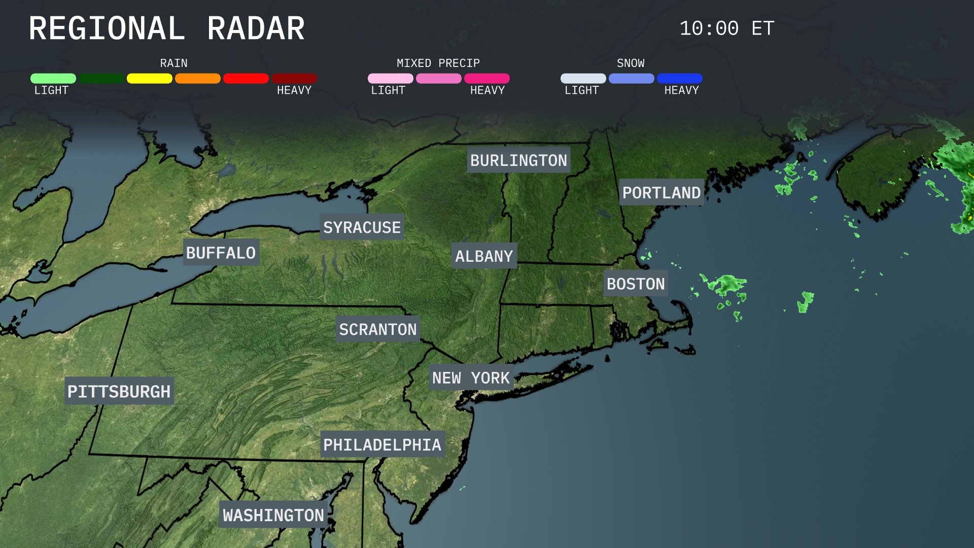 The Northeast Regional Radar shows mainly clear conditions with some light rain showers approaching coastal areas, including Portland. Albany and Syracuse are currently free from precipitation, enjoying clear skies. New York City, Philadelphia, and Boston remain dry as well, with no significant weather systems impacting these urban centers at this time. Meanwhile, light showers off the coast are moving towards Portland but have yet to bring substantial rainfall to the mainland.