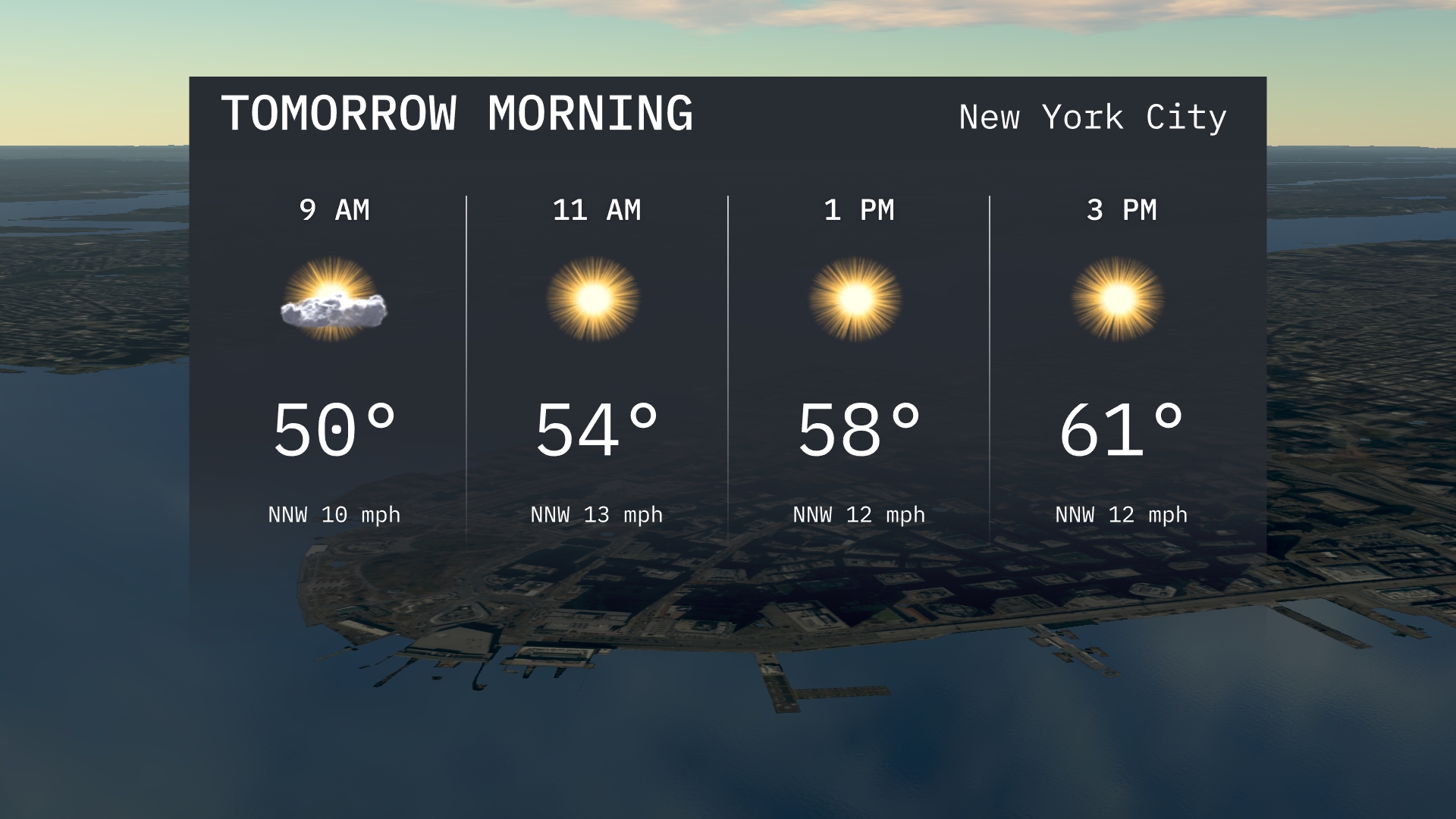 Tomorrow morning in New York City starts off cool with temperatures around 50 degrees at 9 AM. Expect sunny skies as the day progresses, with temperatures rising to 54 degrees by 11 AM. Winds will be from the north-northwest at 10-13 mph, providing a crisp but refreshing breeze.