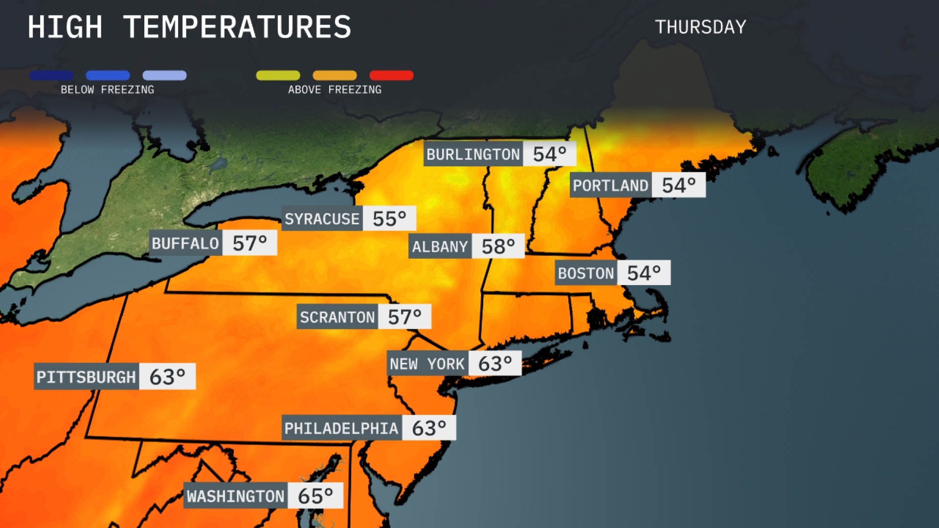 Tomorrow in the Northeast, temperatures will be on the cooler side as fall settles in. New York City is expected to reach a high of 63 degrees, while Philadelphia will also see a maximum of 63. Pittsburgh will warm slightly more to 63 as well, with Buffalo close behind at 57. Boston and Portland are expecting highs of 54 degrees, making it a notably cool day across the region.