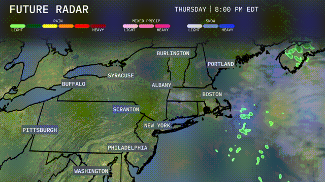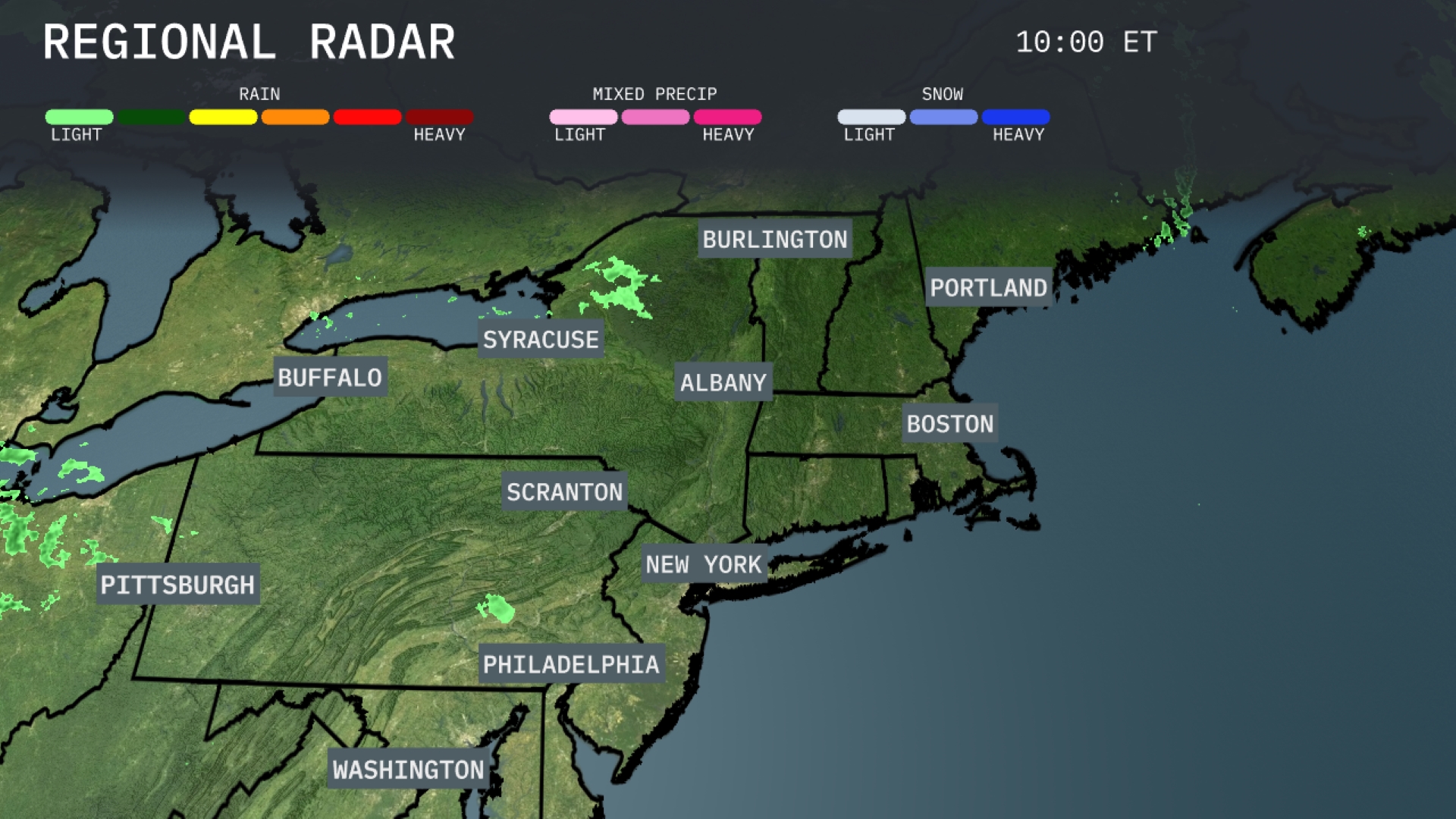 The regional radar for the Northeast shows clear skies across major areas including New York City, Boston, and Albany. Light rain is making its way across northwestern Pennsylvania, near Pittsburgh, and there are spotty showers near Scranton. Burlington and Portland remain free of precipitation, experiencing dry conditions. There’s a touch of rain along the northeastern coast of Maine.