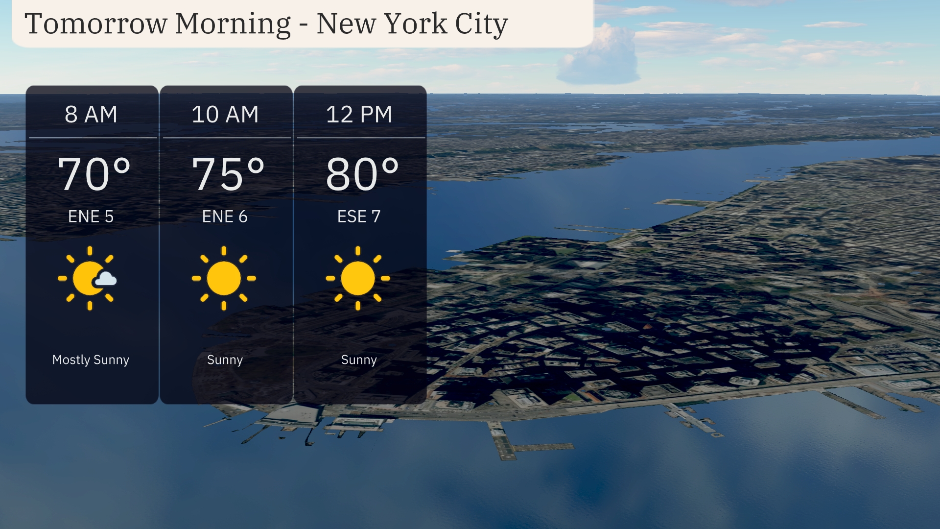 Tomorrow morning in New York City, start your day with mostly sunny skies and enjoy mild temperatures beginning at 70 degrees at 8 AM. By 10 AM, temperatures rise to 75 degrees as the sun shines brightly. A gentle southeast wind will accompany the warm-up, shifting from an east-northeast flow at 5 miles per hour to east-southeast at 7 miles per hour by noon, when temperatures reach a pleasant 80 degrees.