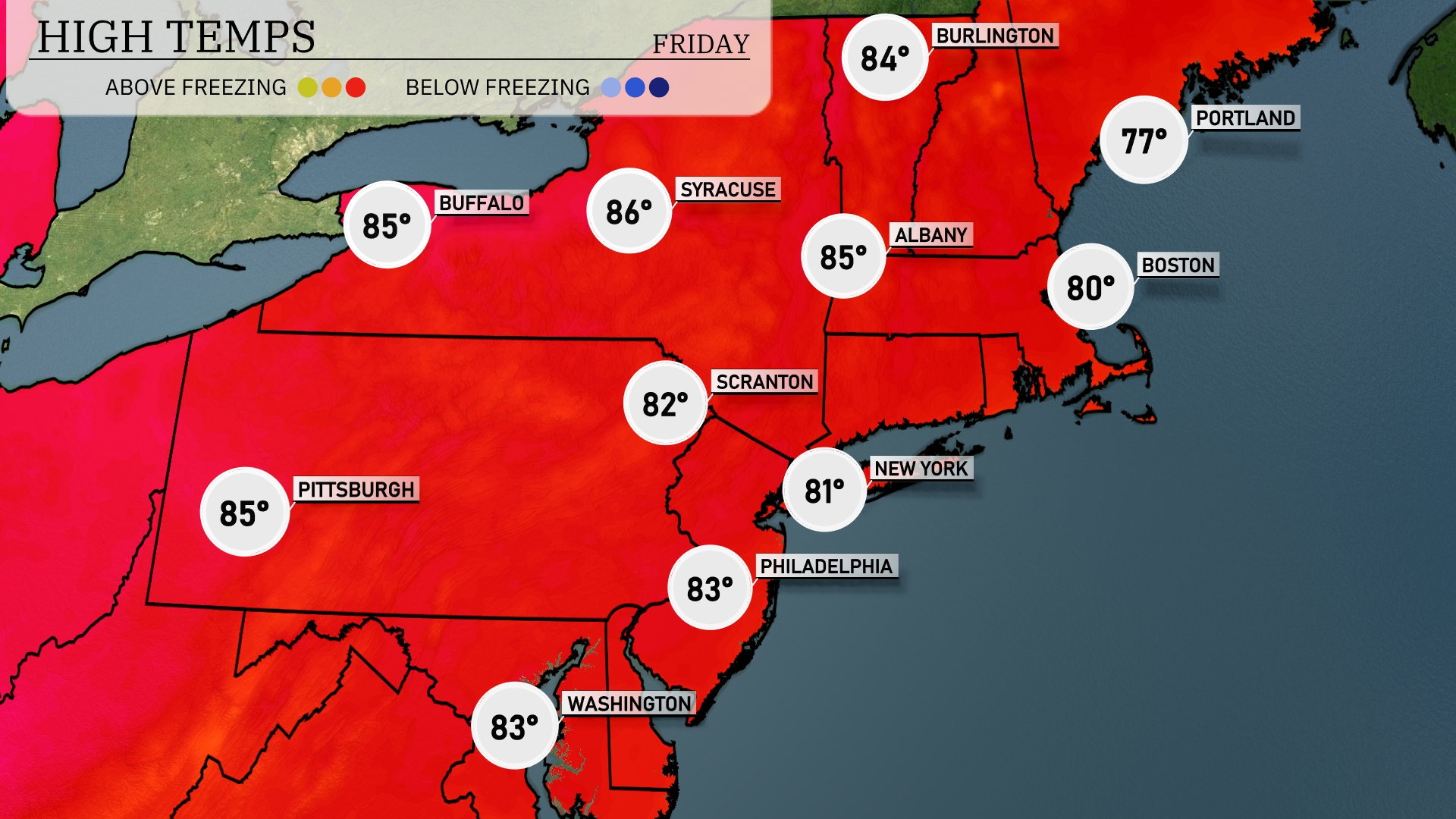 Tomorrow in the Northeast, temperatures will soar to the mid-80s. Buffalo and Pittsburgh are both expected to reach 85 degrees, while Syracuse tops out at an impressive 86 degrees. Philadelphia will see a high of 83 degrees, with New York City close behind at 81 degrees. Boston will enjoy a pleasant 80 degrees, slightly above average for this time of year.
