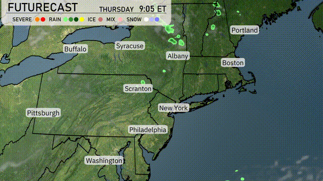 An approaching frontal system brings a round of showers and scattered thunderstorms to the Northeast beginning Thursday morning. Areas from Scranton to Albany should prepare for afternoon storms, some possibly reaching severe levels with gusty winds. Heavier rainfall could lead to localized flooding in spots, particularly across urban areas. A dip in temperatures follows the front, with mild air settling over Boston and New York as skies clear by late Thursday.