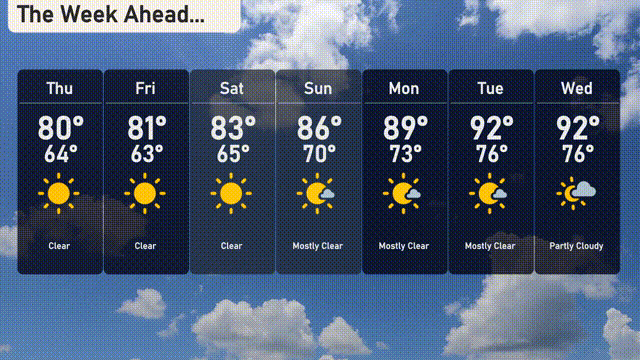 Sunday: Mostly clear weather with temperatures peaking at 86 degrees and a nighttime low of 70 degrees.