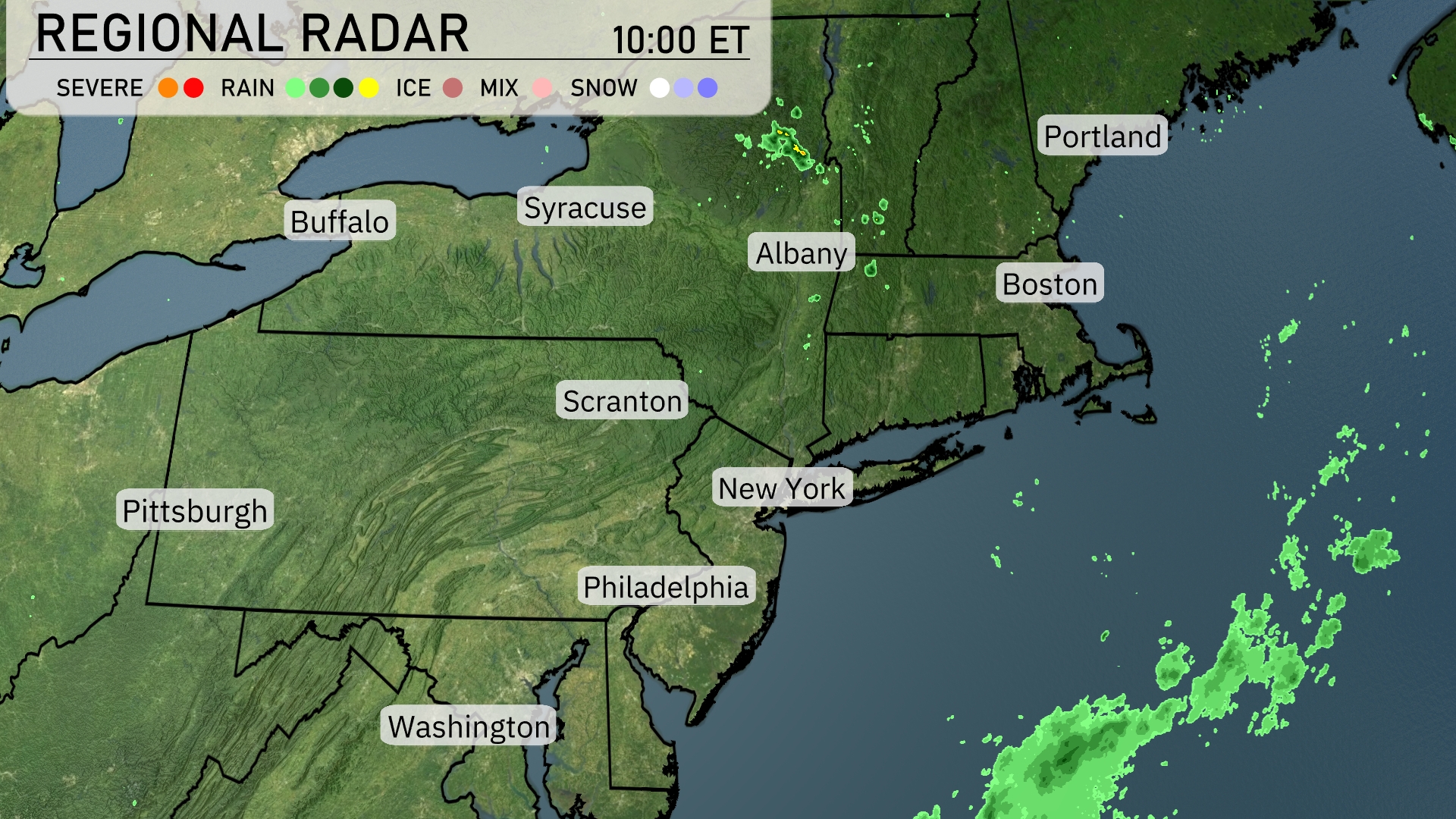 A tranquil start across much of the Northeast, with clear conditions dominating. However, isolated showers are spotted in upstate New York, particularly north of Albany. Southeast of New England, off the coast, showers are poised and may influence coastal weather later. Meanwhile, cities like Boston and New York remain dry as cloud cover stays minimal for now.