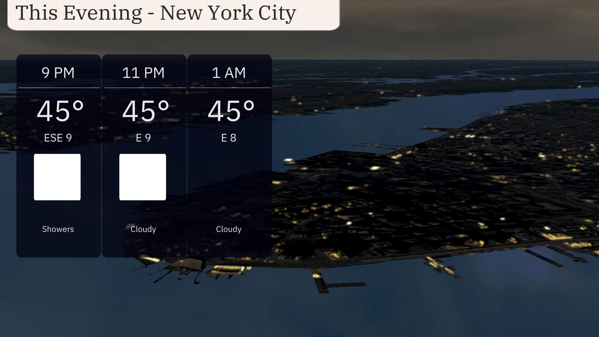 For this evening in New York City, the temperatures will hold steady at 45 degrees from 9 PM through 1 AM. Showers expected at 9 PM will taper off, giving way to cloudy skies as the night progresses. Winds will be easing as they shift from ESE at 9 PM to E by 11 PM, and then to E at 1 AM.
