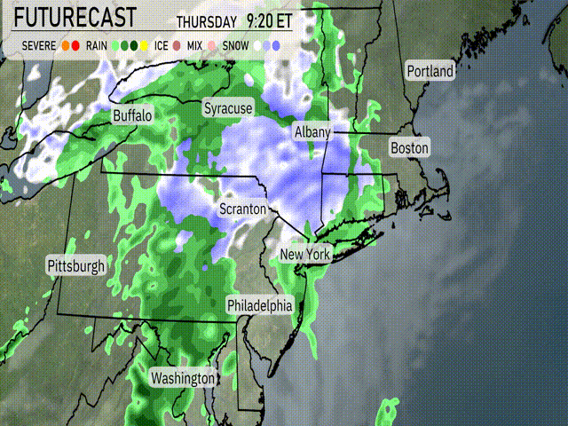 Buffalo is bracing for heavy snowfall, with snow moving eastward across northern New York. Syracuse is currently under a snow cover, with conditions expected to persist throughout the day. Albany remains clear for now, but cloud cover is increasing as the wintry mix makes its way east.