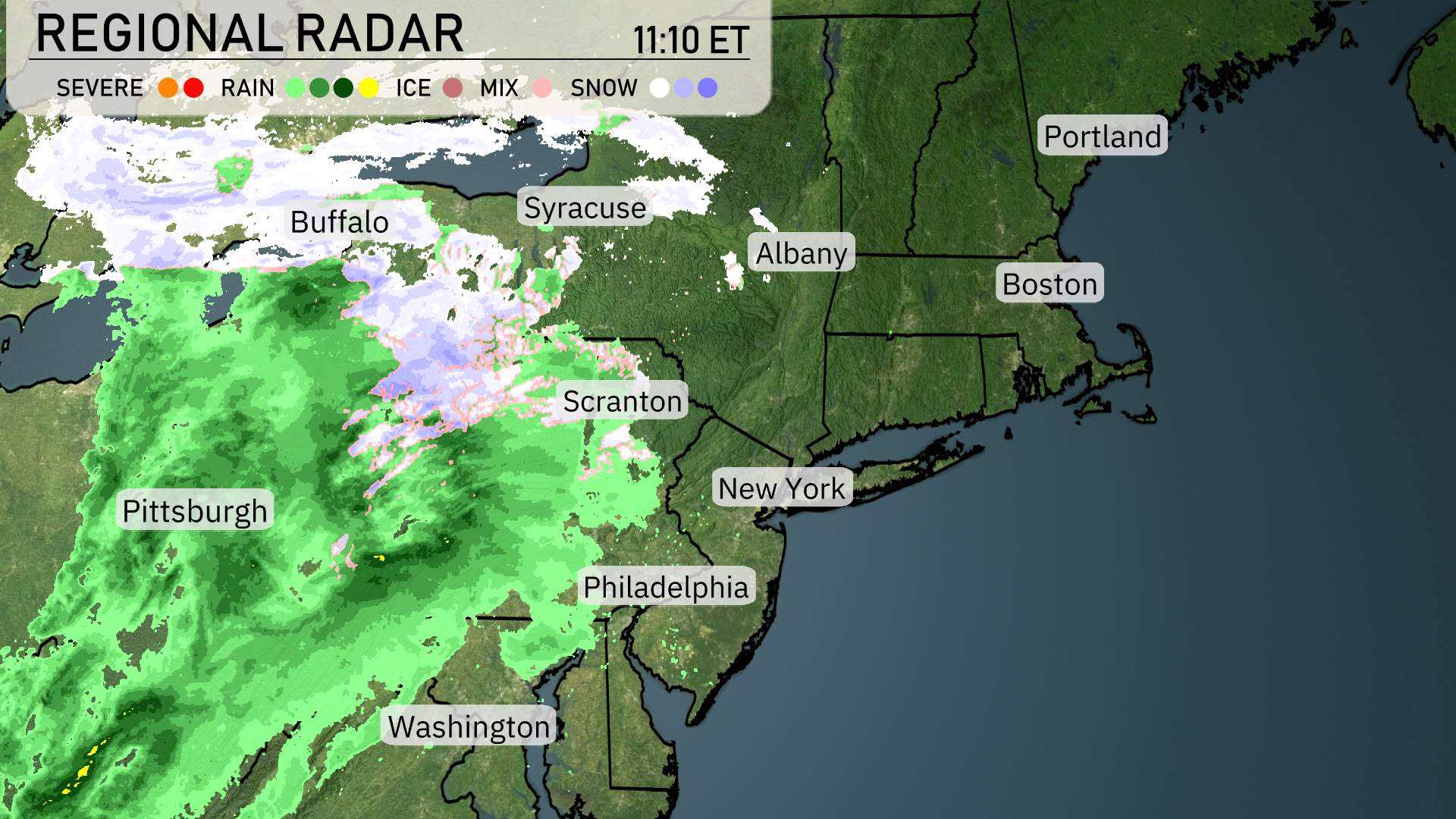 Over the Northeast, a significant weather system is bringing a mix of rain, ice, and snow across the region. Western Pennsylvania, around Pittsburgh, is experiencing consistent rain showers moving northeast. As this rain advances, it transitions into a wintry mix around Scranton, creating slick conditions.