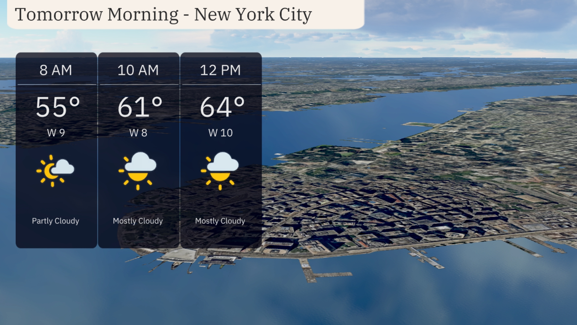 Tomorrow morning in New York City, temperatures begin at 55 degrees at 8 AM with a west wind at 9 miles per hour and partly cloudy skies. By 10 AM, temperatures rise to 61 degrees as cloud cover increases to mostly cloudy, with winds shifting from the west at 8 miles per hour. At 12 PM, expect 64 degrees with mostly cloudy conditions and a west wind at 10 miles per hour.
