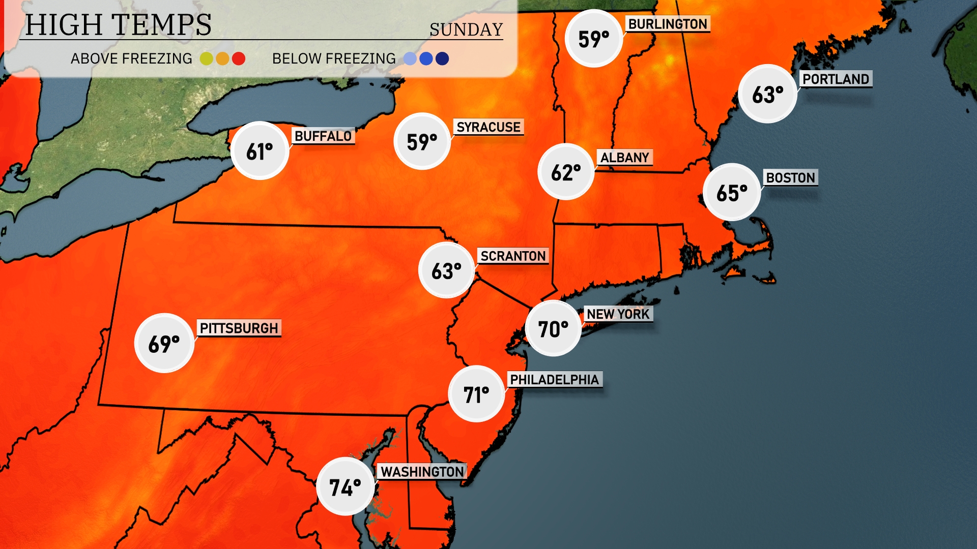 Tomorrow New York reaches a pleasant 70 degrees, while Philadelphia is slightly warmer at 71. Boston is expected to see a high of 65 degrees, and Albany will warm up to 62. Meanwhile, Pittsburgh enjoys a comfortable 69 degrees, as Scranton stays cooler at 63 and Syracuse lags behind at 59.