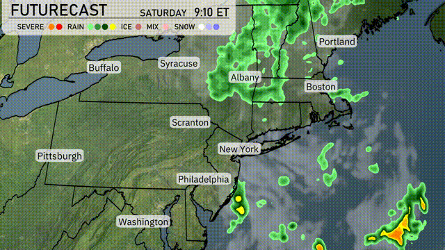 Rain showers spread across the Northeast into tomorrow, with Albany and Boston receiving moderate rainfall. Expect occasional downpours and localized flooding in lower lying areas. Temperatures remain steady with highs in the mid-60s and lows in the mid-50s. While no severe storms are predicted, the wet conditions could disrupt weekend plans. The moisture tapers off by Saturday evening, allowing for a drier and cooler Sunday.