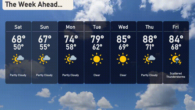 Sunday: A mix of sun and clouds with temperatures reaching 67 for a high, cooling to 55 at night.