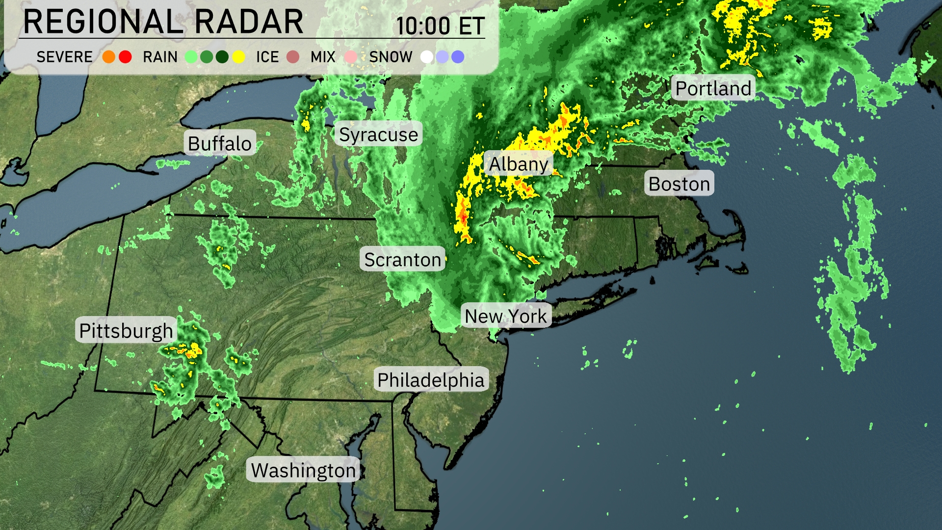 A robust storm system is currently sweeping through the Northeast, with moderate to heavy rain dominating areas from Syracuse through Albany and extending into Boston. New York City and Philadelphia are experiencing overcast skies as the rain approaches. This moisture-laden system is moving northeastward, drenching northern New Jersey and eastern Pennsylvania. Pittsburgh and Buffalo are mostly clear, though isolated showers are developing west of Scranton. Seattle-like drizzle is settling in over Washington, with clear conditions extending toward the middle of the state.