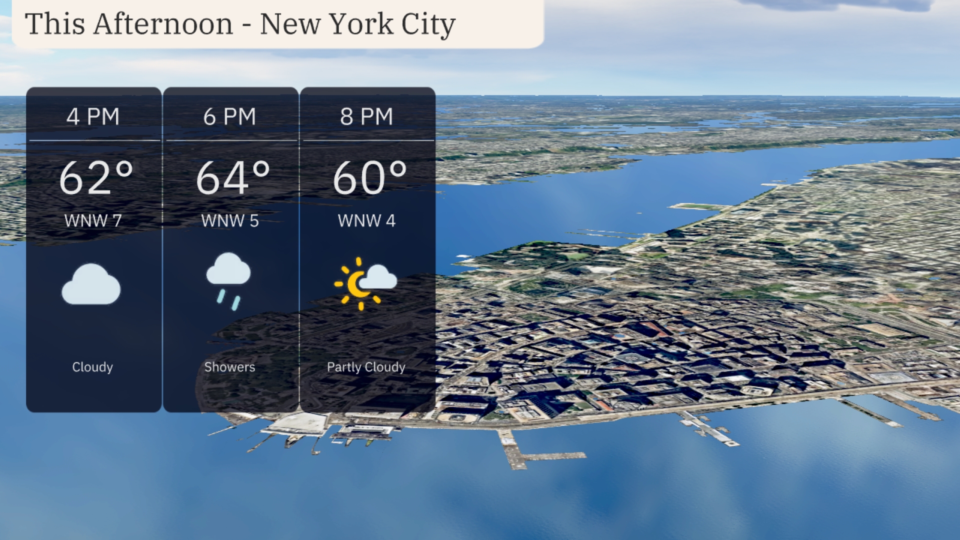 For the afternoon in New York City, temperatures rise to around 62 degrees under cloudy skies with winds from the west-northwest at 7 mph. Showers are likely by 6 PM as temperatures increase slightly to 64 degrees, with winds shifting to 5 mph from the west-northwest. By 8 PM, expect partly cloudy conditions with temperatures at 60 degrees and a gentle breeze at 4 mph from the west-northwest.
