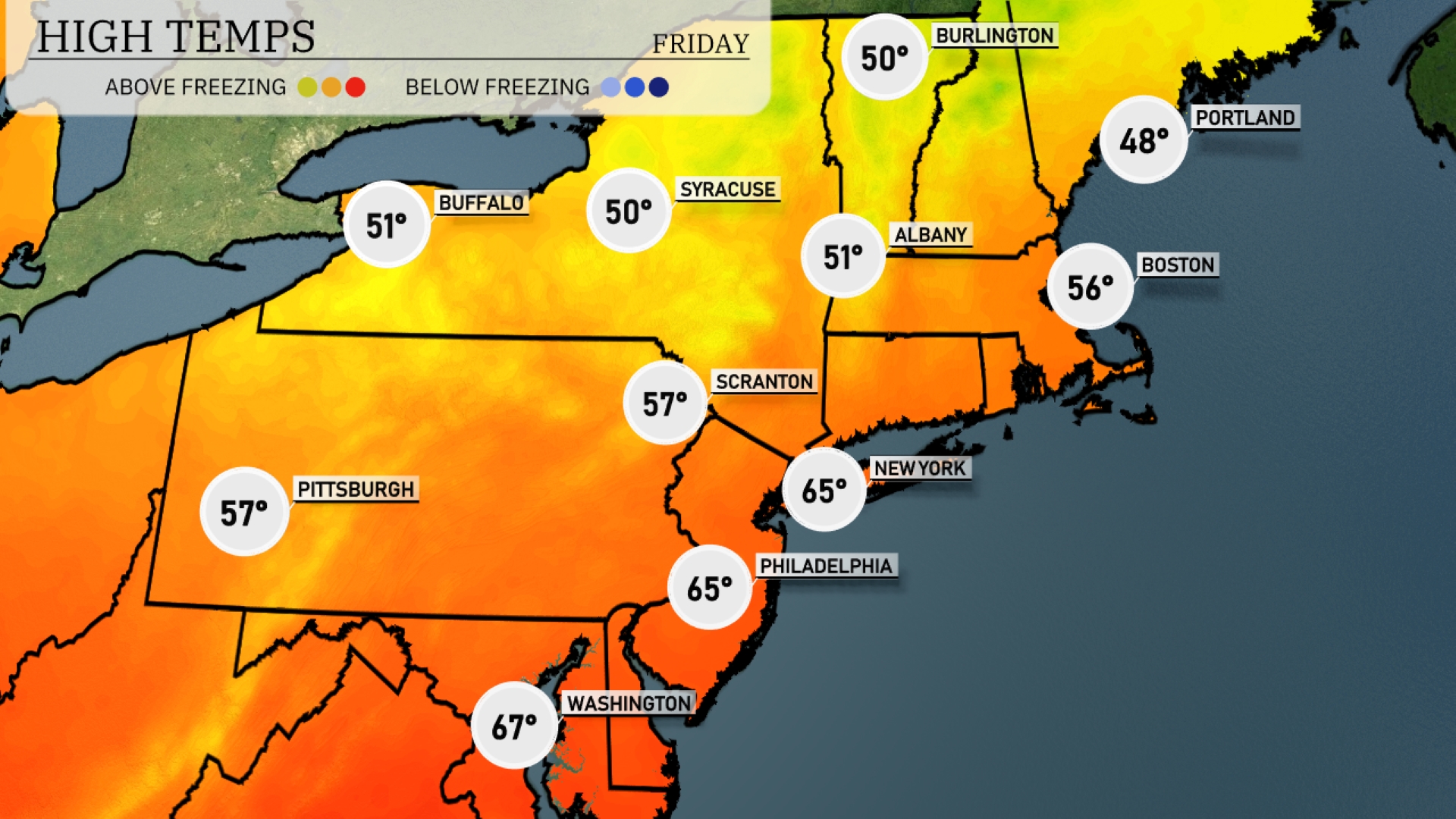 Today in New York City, expect a high of 65 degrees, while Philadelphia is also reaching 65, creating a warm pocket in the urban corridor. Moving north, Boston is experiencing a cooler day with a high of 56 degrees, and Albany is slightly warmer at 51. Scranton is coming in at 57 degrees, just above Pittsburgh’s high of 57 as well. Portland is the coolest spot in the region with a high of 48 degrees.