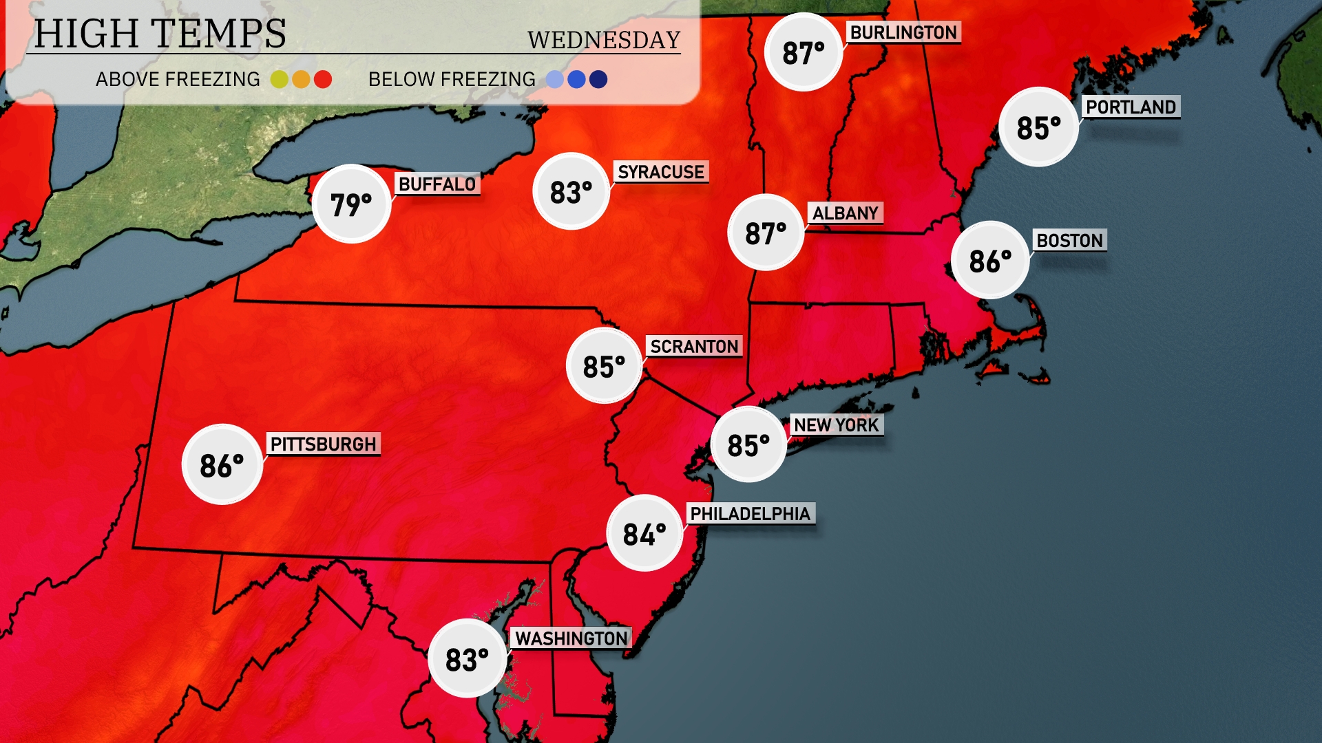 In the Northeast today, the temperatures are warming up nicely. New York City and Philadelphia both have highs around 85 degrees, while Boston will hit 86. Scranton is slightly cooler at 85 degrees, and Pittsburgh reaches a comfortable 86. Farther north, Albany is seeing a high of 87, while Syracuse comes in at a pleasant 83 degrees. Expect plenty of sunshine across the region, with minimal chances of precipitation.