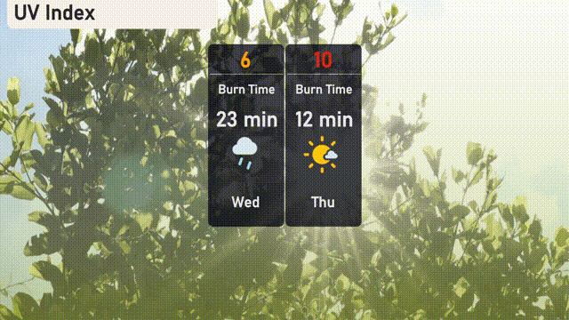 The UV index in New York City on Wednesday is moderate with a value of 6, meaning a sunburn can happen in about 23 minutes of direct exposure. By Thursday, the index jumps to an intense 10, reducing the burn time to just 12 minutes.