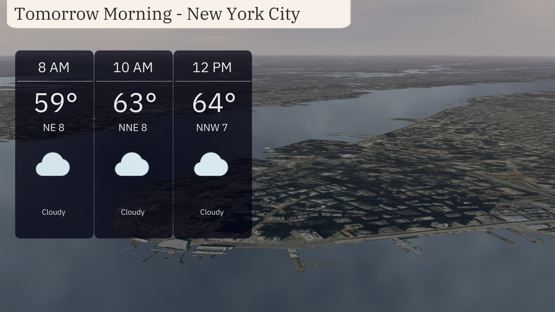 Cloudy morning in New York City with temperatures starting at 59 degrees at 8 AM, rising to 64 degrees by noon. There will be a light northeasterly breeze shifting to the north-northwest at 7 to 8 miles per hour through the morning.