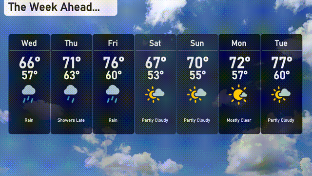 For the 7-day forecast in New York City: Wednesday: Rainy conditions with a high of 66 degrees and a low of 57 degrees. Thursday: Showers develop late in the day, with temperatures rising to 71 degrees and a low of 63 degrees. Friday: Warm and rainy, hitting 76 degrees for the high and cooling to 60 degrees. Saturday: Partly cloudy skies, with a comfortable high of 67 degrees and a low of 53 degrees. Sunday: Expect more sun with a high of 70 degrees and a nighttime low of 55. Monday: Mostly cloudy, with a high of 72 degrees and a low of 57 degrees. Tuesday: Partly cloudy skies, with temperatures climbing to a lovely 77 degrees during the day and a low of 60.