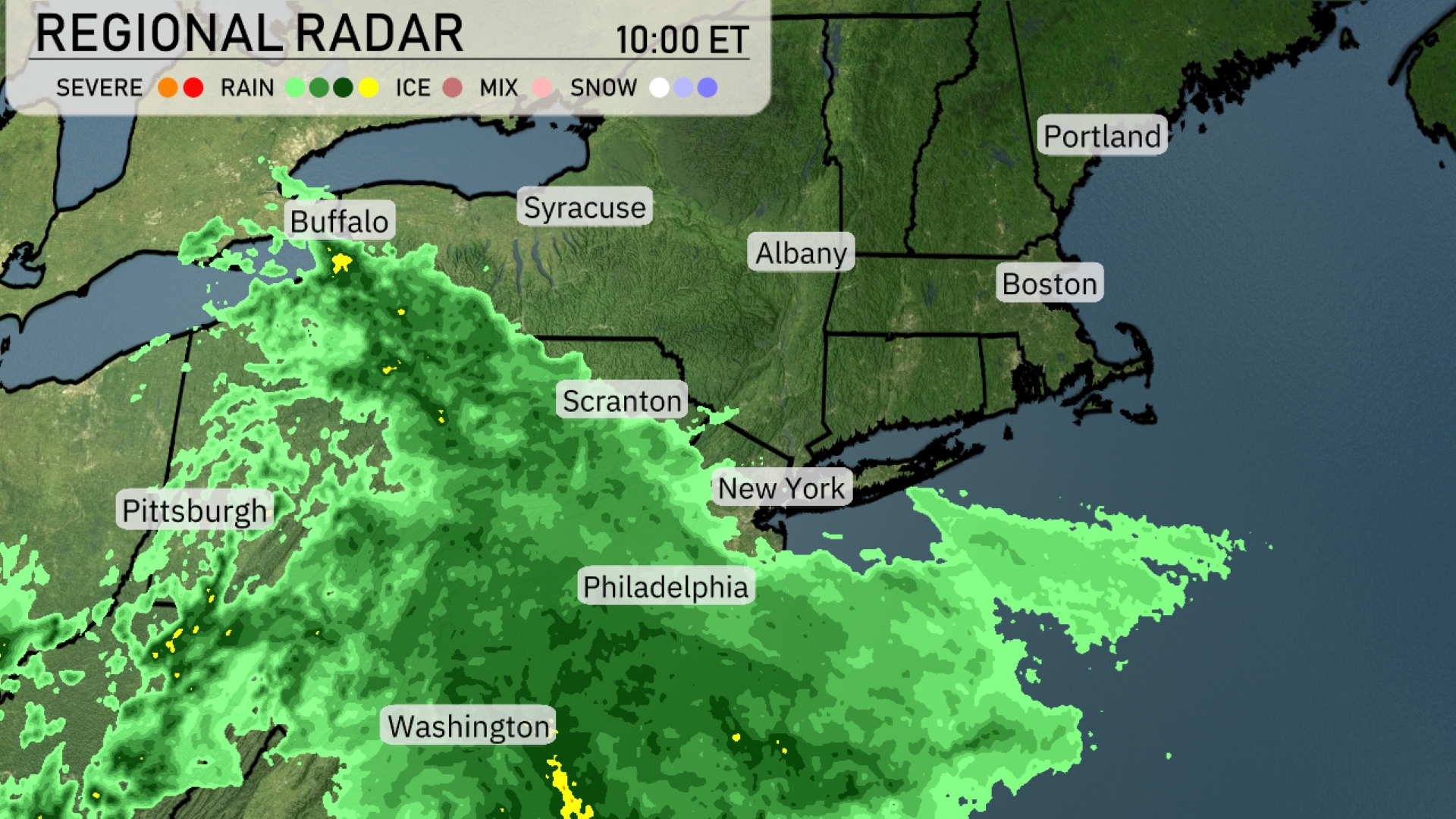 The Northeast is currently experiencing an extensive rain system stretching across several states. From Pittsburgh to Scranton, you’ll find moderate rainfall covering the area. Philadelphia and New York are also under a consistent blanket of rain, with precipitation spreading towards the east. Light rain has begun making its way into Boston, while Albany and Portland remain dry for now. As this weather pattern moves through, keep an umbrella handy if you’re in the vicinity of these showers.