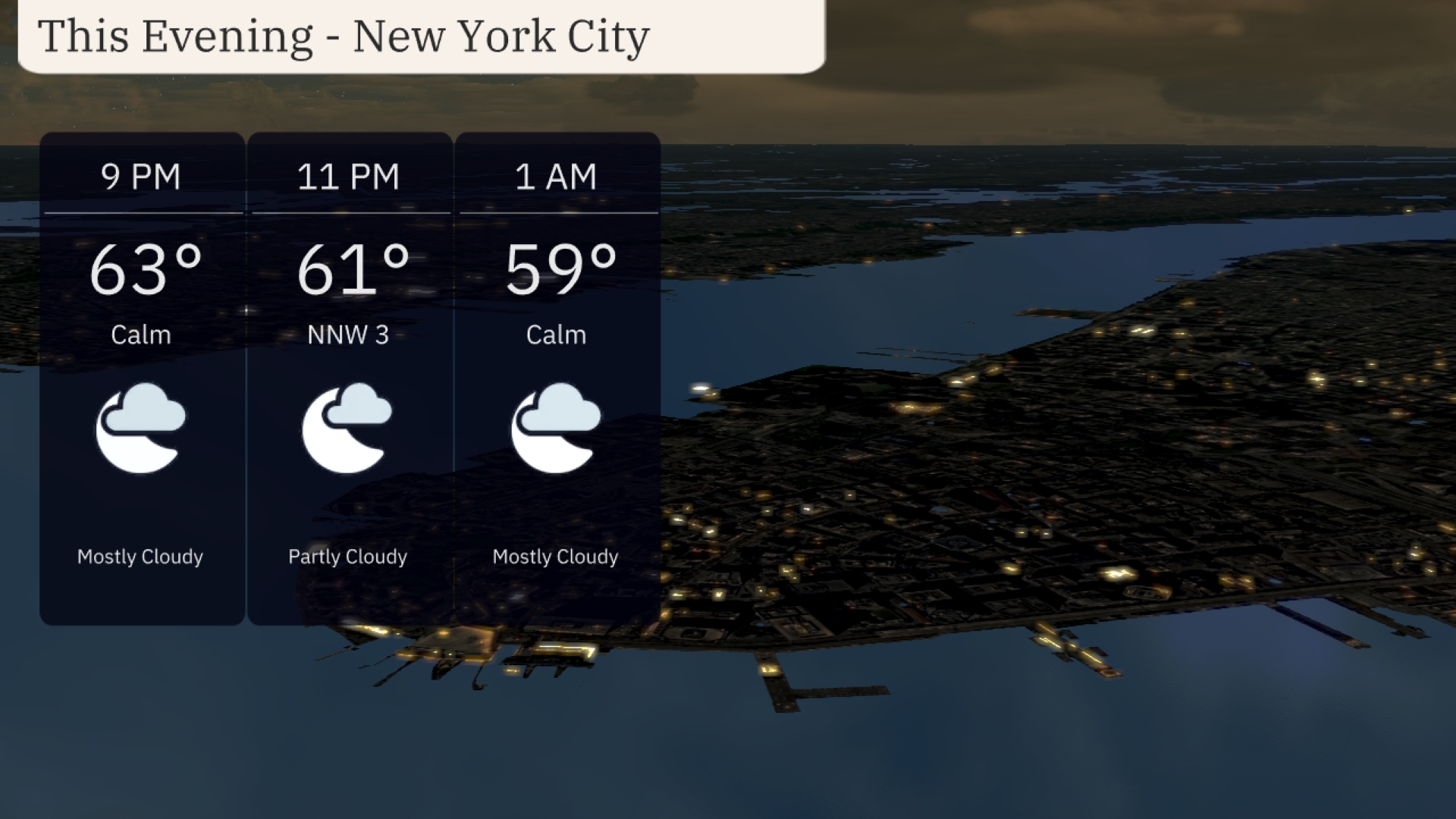 As the evening unfolds in New York City, expect mostly cloudy skies. Temperatures will drop gradually from 63 degrees at 9 PM to 59 degrees by 1 AM. Winds will remain light, with a brief shift to the northwest at 3 miles per hour around 11 PM.