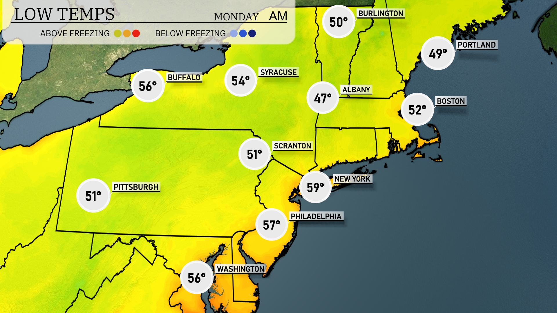 Tonight New York City can expect a low of 59 degrees, while Philadelphia will see a mild 57. Scranton drops to 51, and farther north, Albany will chill to 47 degrees. Boston’s low will register at 52, but Portland gets even cooler at 49 degrees. Expect the overnight temperatures to feel cool, particularly in western Pennsylvania, where Pittsburgh will settle at 51 degrees.