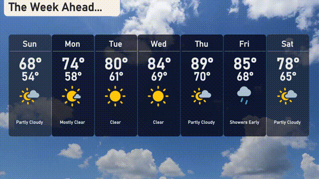 Friday: Expect showers early, then partly cloudy conditions, with a high of 85 degrees and a low of 68.