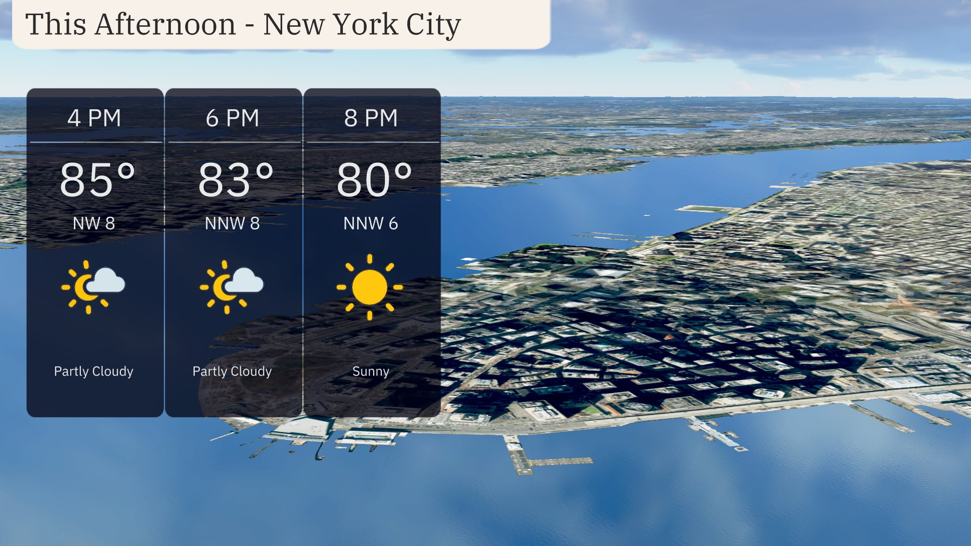 This afternoon in New York City, temperatures will peak at 85 degrees around 4 PM with partly cloudy skies. Expect a north-northwest wind at 8 mph, reducing slightly to 6 mph by 8 PM. As the evening progresses, the temperature will gradually drop to 80 degrees under clear skies.