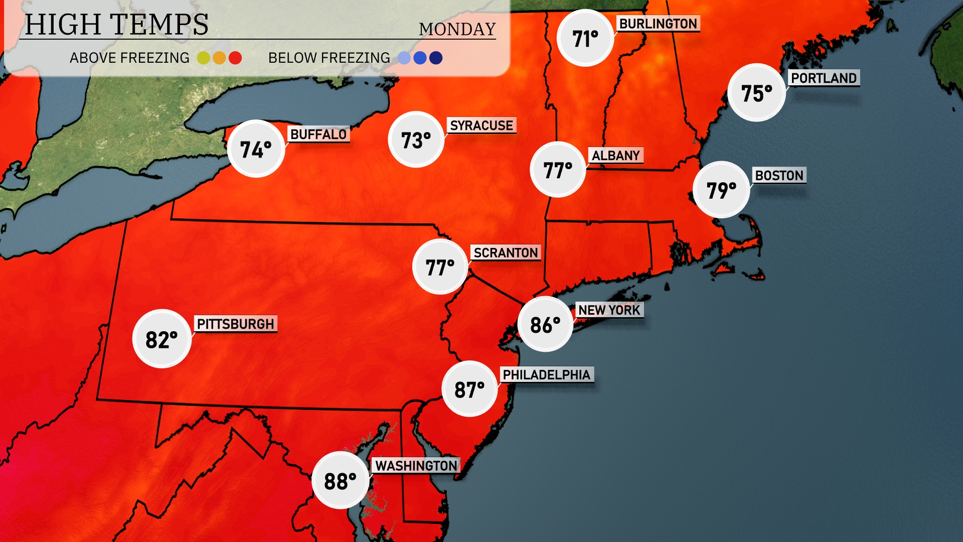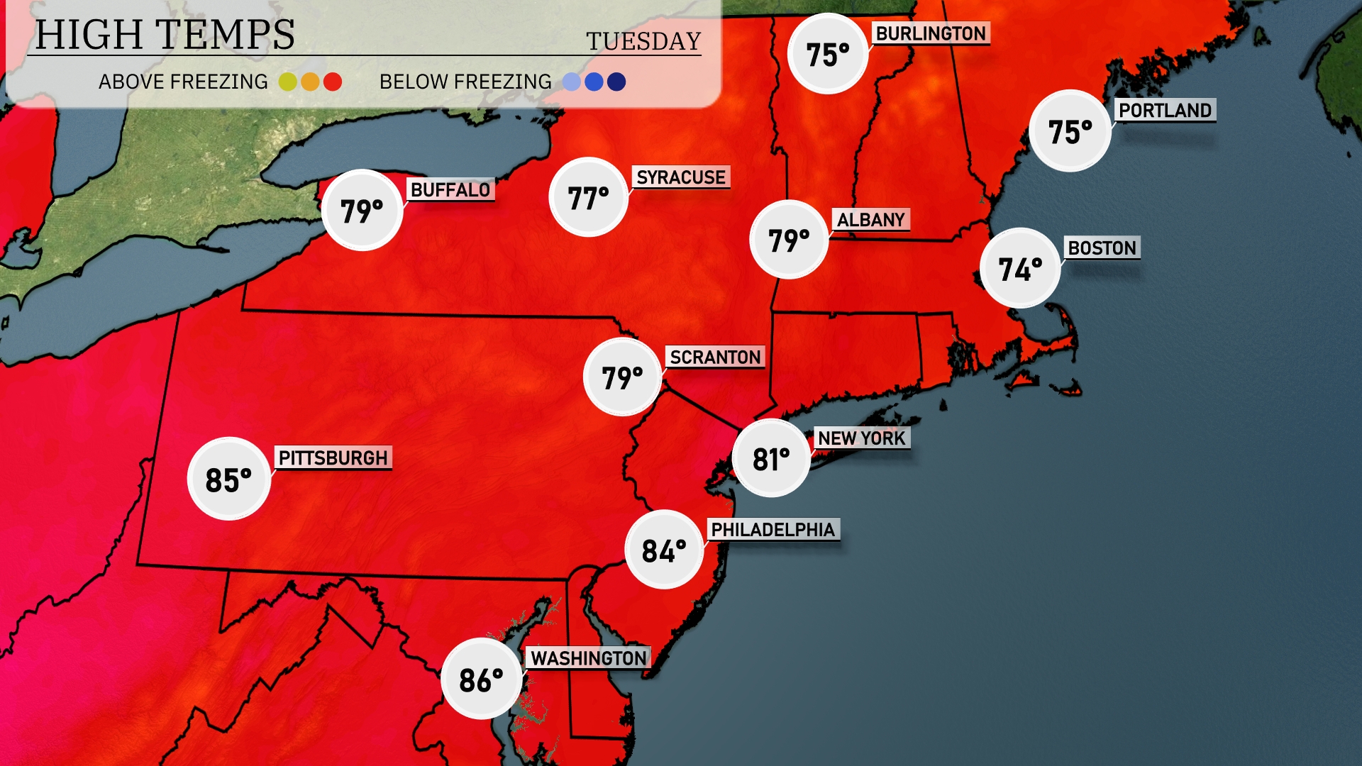 Tomorrow, the Northeast will experience warm temperatures, with Pittsburgh leading the way at 85 degrees. Philadelphia is expected to see a high of 84, while New York City will warm up to 81 degrees. Scranton and Syracuse are both forecasted for 79 degrees, and Boston will have a cooler afternoon high of 74.