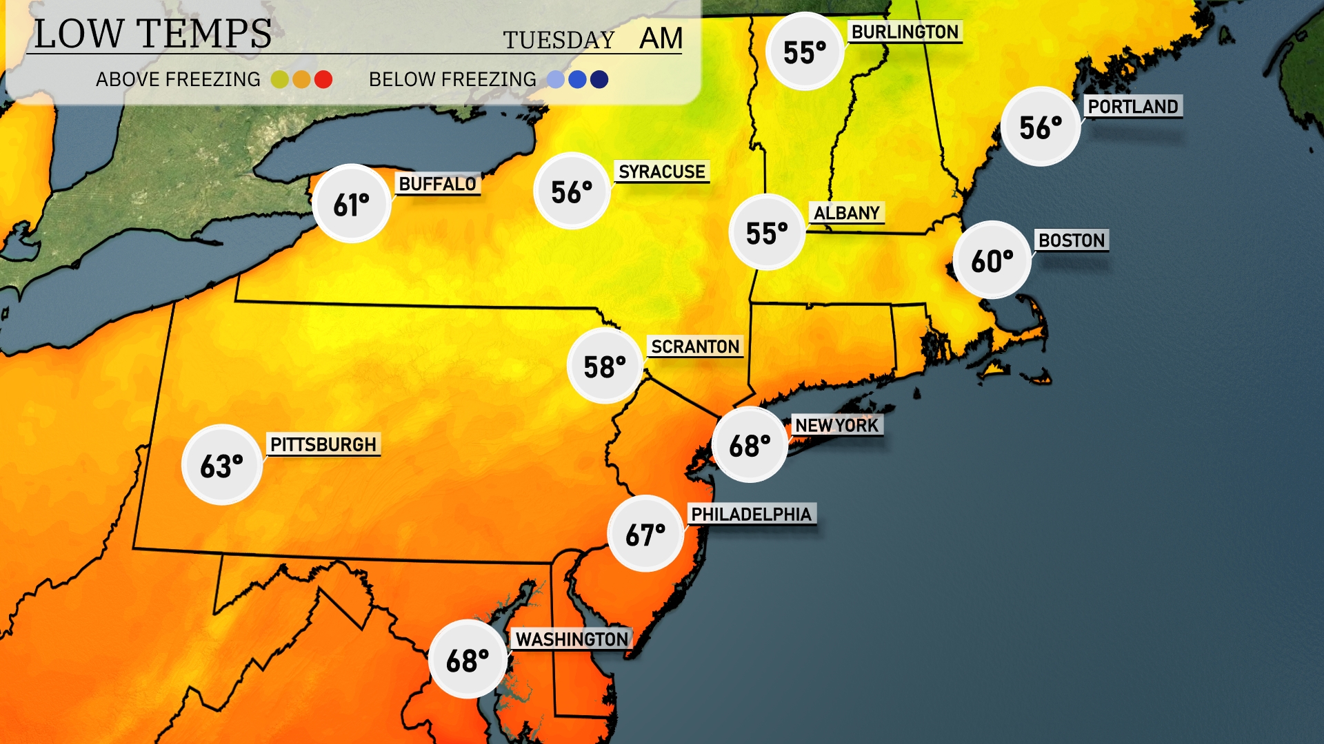 Tonight, Boston will see a low of 60 degrees, while Portland drops to 56. In New York, the temperature will settle at 68 degrees, making for a mild evening. Scranton expects a cooler night at 58 degrees, and Buffalo will experience a low of 61.