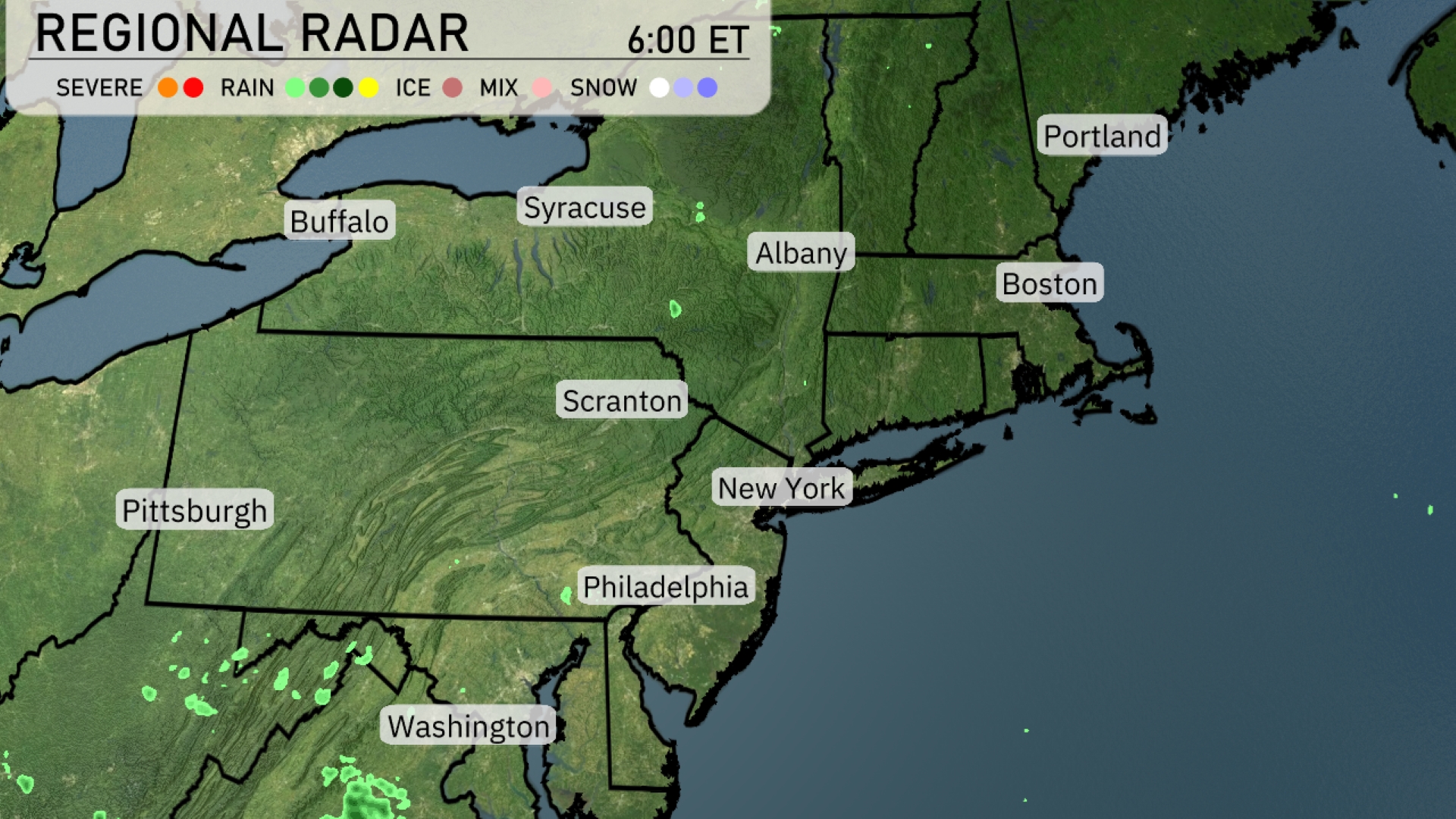 Across the Northeast, the radar is mostly clear, with only isolated patches of light rain near the Scranton area. A slight hint of precipitation is seen moving towards the Pittsburgh area. The rest of the region, including New York, Boston, and Philadelphia, enjoys clearer skies. Heavier showers are located to the southwest, just near the West Virginia border.