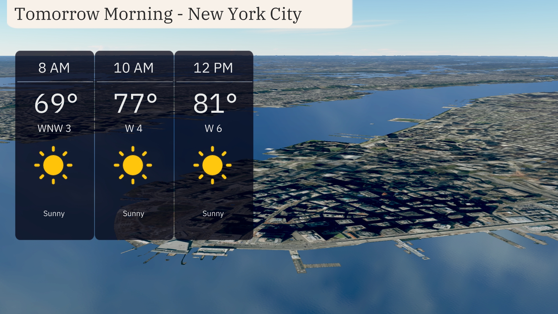 Expect a sunny and warm start to your morning in New York City, with temperatures beginning at 69 degrees at 8 AM. Winds will be coming out of the west-northwest at 3 miles per hour. By 10 AM, the temperature will rise to 77 degrees with winds steady from the west at 4 miles per hour. By midday, enjoy clear skies with a temperature reaching 81 degrees as winds shift slightly from the west at 6 miles per hour.