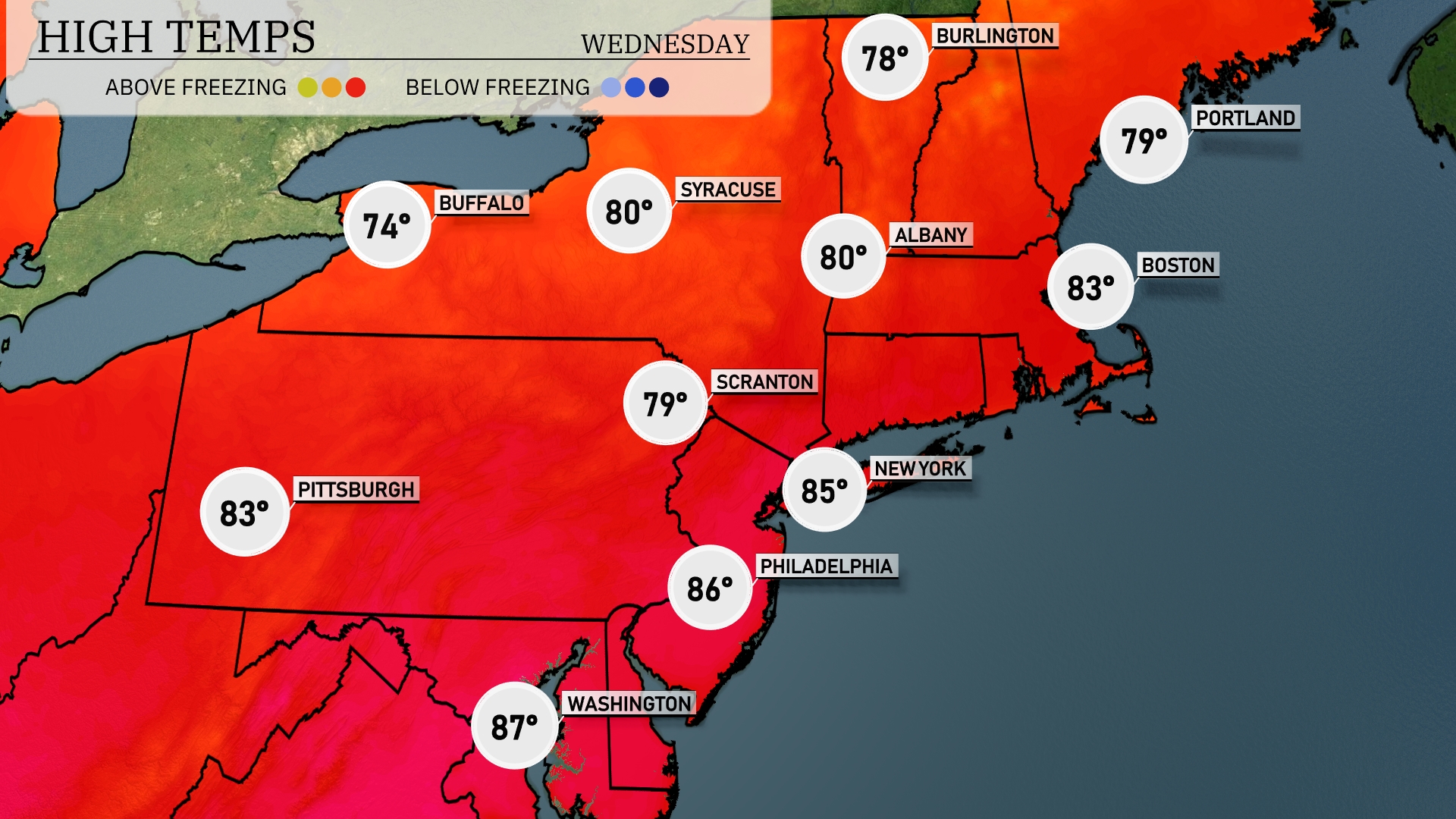 Tomorrow, the Northeast is heating up with New York City reaching a high of 85 degrees. Philadelphia will be even warmer at 86 degrees, while Scranton sees a pleasant 79 degrees. Boston is expected to hit 83 degrees, and Buffalo will be slightly cooler at 74.