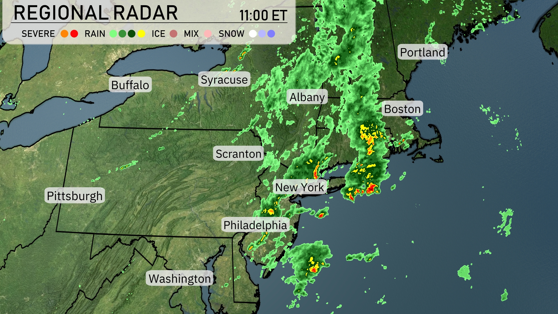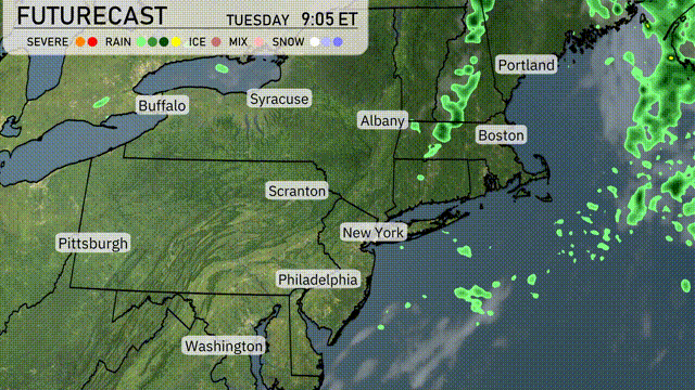 A line of storms is tracking through the Northeast, with heavy rain and thunderstorms along the coastal areas. New York City is experiencing intense rainfall, while storms are pushing northeast toward Boston. Philadelphia and New York are both under rain showers, with occasional intense bursts. Albany is seeing lighter precipitation, with clouds extending into areas like Syracuse and Buffalo.